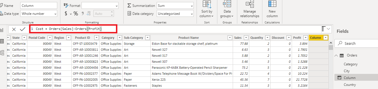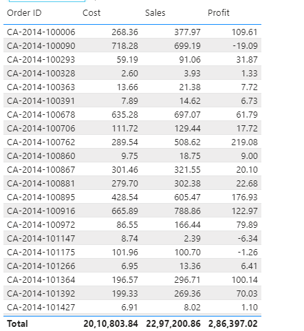 You can easily rename the column. One great and key learning which I came across is you can easily apply calculated columns in the page level filters but not the measures. I am creating a table that consists of an Order ID, sales, cost, and profit.