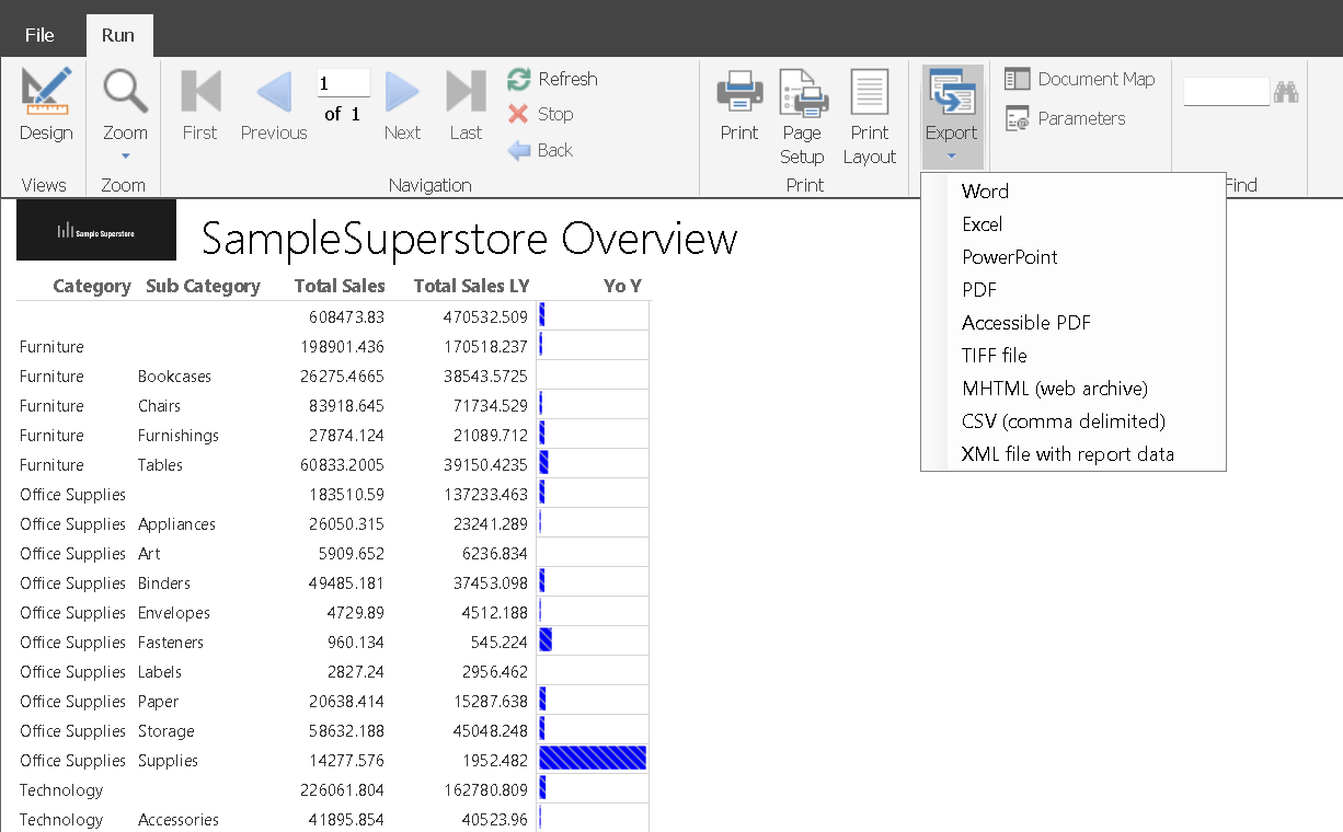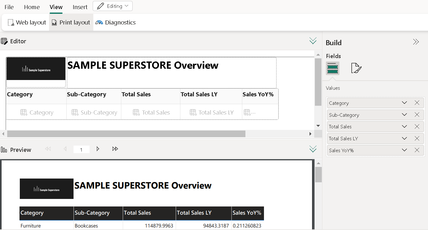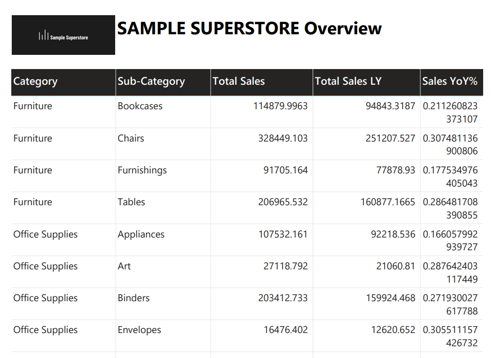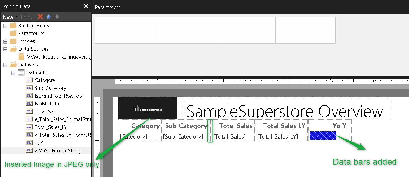 For demo, we have pulled all fields in values and if you analyse critically then you will notice we have noticed a few columns similar to excel. We have included the Sample Superstore logo but do note in report builder it only consider JPG format pictures. Last and my favourite is data bars for YoY with a touch of formatting to it. There are tons of possibilities to format your final table.