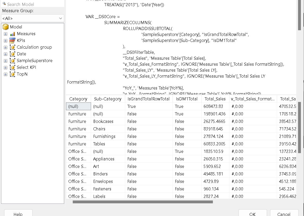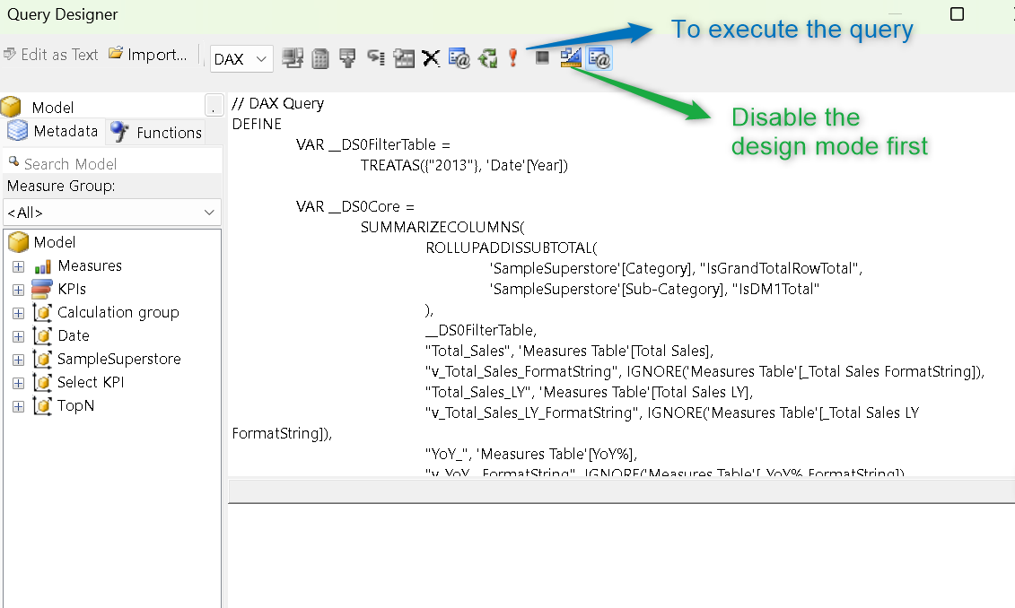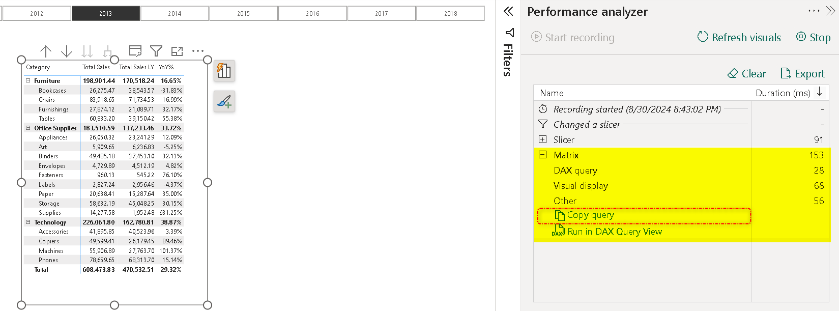 Before going to Query Design, we will heading back to our dashboard to get the query of the matrix which contains - Category, Subcategory, Total Sales, Total Sales LY & YoY%. Good part is you can evaluate the performance of different visuals with the help of these queries and DAX Studio. To know more about it do refer this blog where we covered all the basics on how to optimize your DAX.