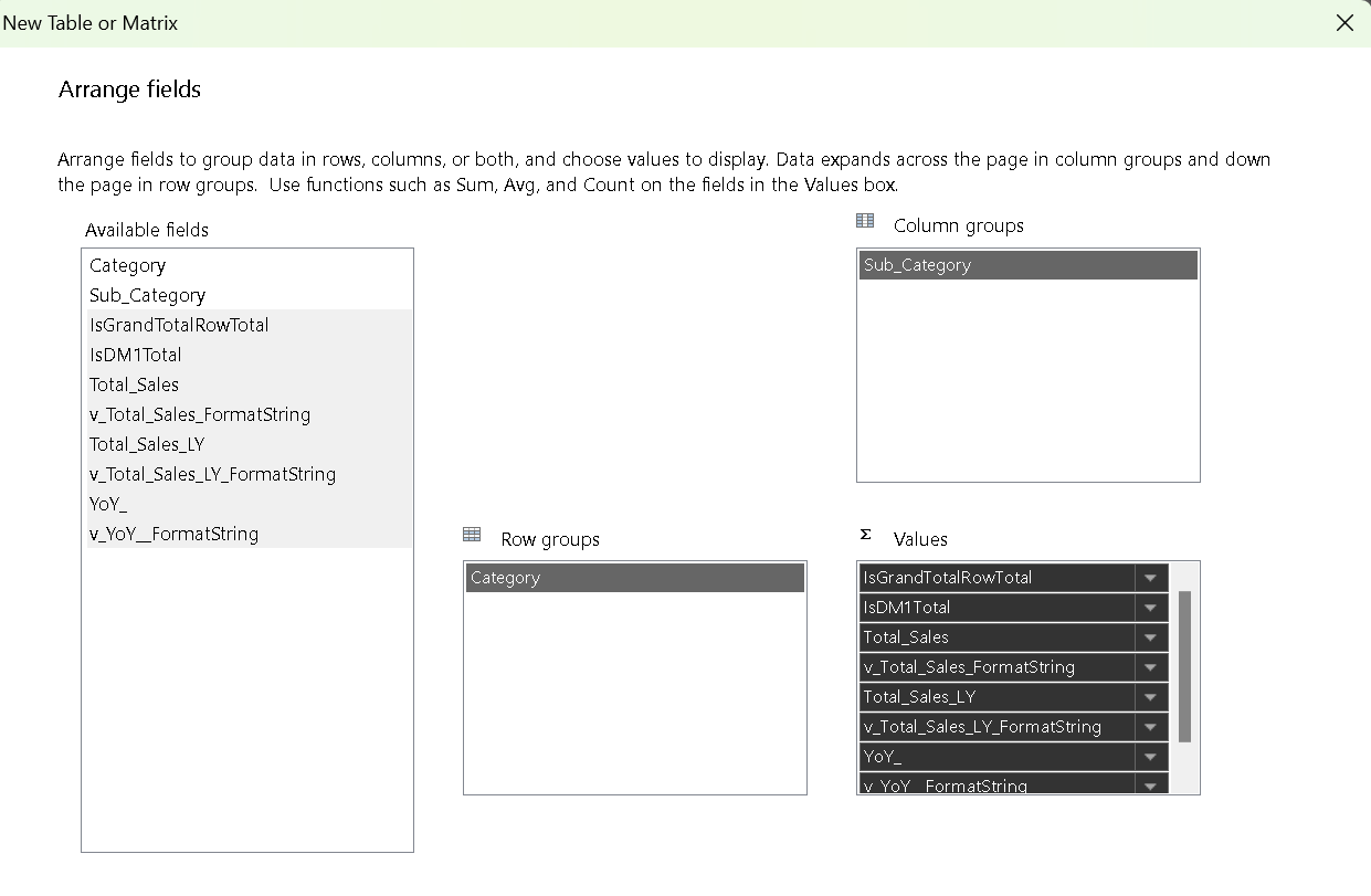 Doesn't it look like a Pivot table😜? If you have come across different articles related to report builder then all the authors advised to put all the fields in values. It will work for sure but I would advise to play with different options to figure out why we pulled all fields in values.