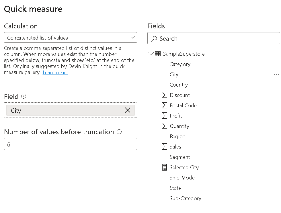 We can do the same using quick measures for that create a quick measure and in the calculation, we need to select the concatenated list of values, in the field we will take the city.