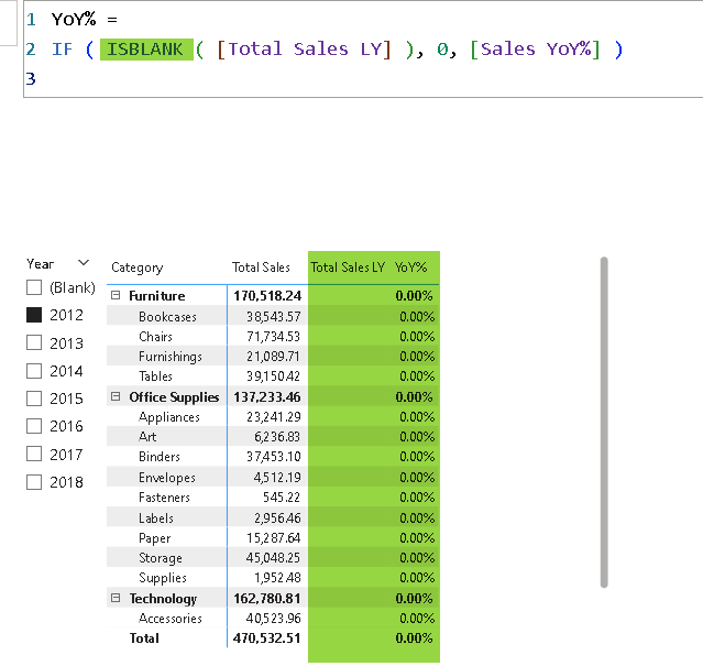 The YoY% will return blank as there is no historical data before 2012. To tackle such scenarios it is always advised to use ISBLANK with a simple IF condition. In the DAX, we have stated IF the total sales last year is blank that show 0 otherwise YoY%.