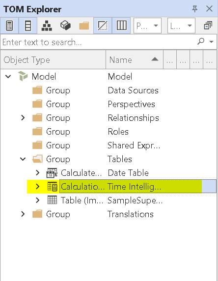 Under external tools, you can find Tabular Editor. Once you open it you can see the tables you are using. To create a calculation group you can right-click on the table and under create you can find the calculation group or you can do the same with the help of the shortcut (Alt+7). I am naming the group Time Intelligence.