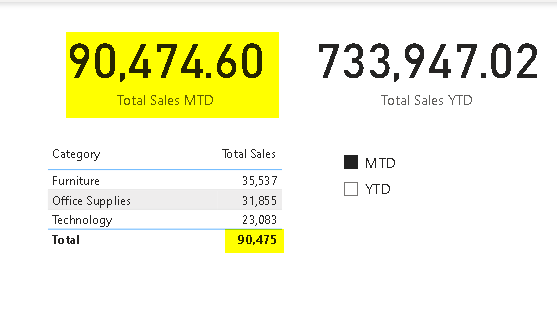 Let's take a look at how you can use the calculation group in the dashboard. I have a table with sales associated with every category. I have created a slicer that includes the calculation items we created once you select MTD the values in the table get adjusted to MTD values and similarly for YTD. Just to double-check whether we are getting the right results I have created basic DAX for MTD and YTD.