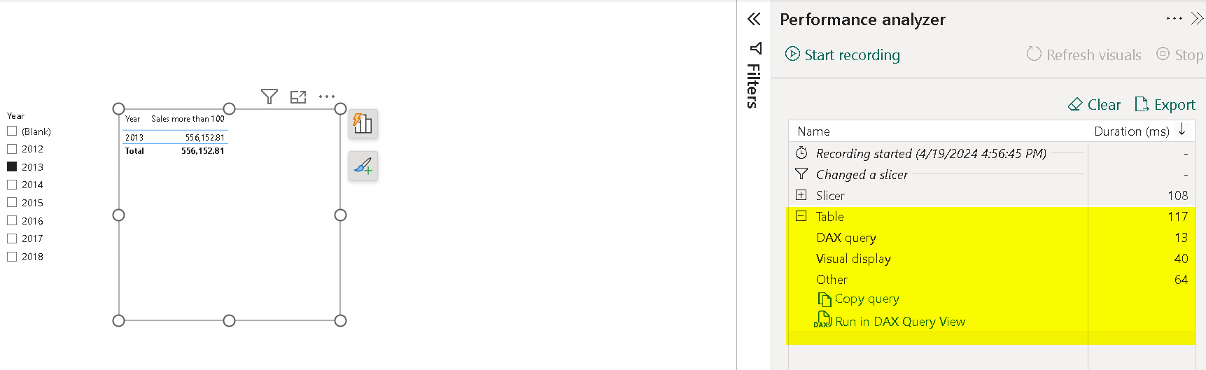 Now, we have included this measure in a table along with the year coming from date table. Also, we have started recording with the help of Performance Analyser. Since our table is taking the most time to render let's evaluate the query running behind our DAX.
