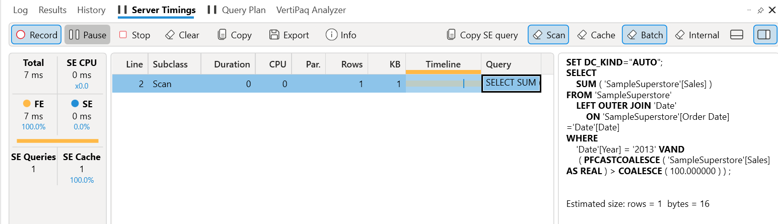 Now run the copied query and go to the server timings. What the heck is going on here? FE? SE? If you are not a fan of acronyms like me then FE stands for Formula engine while the SE stands for Storage Engine.