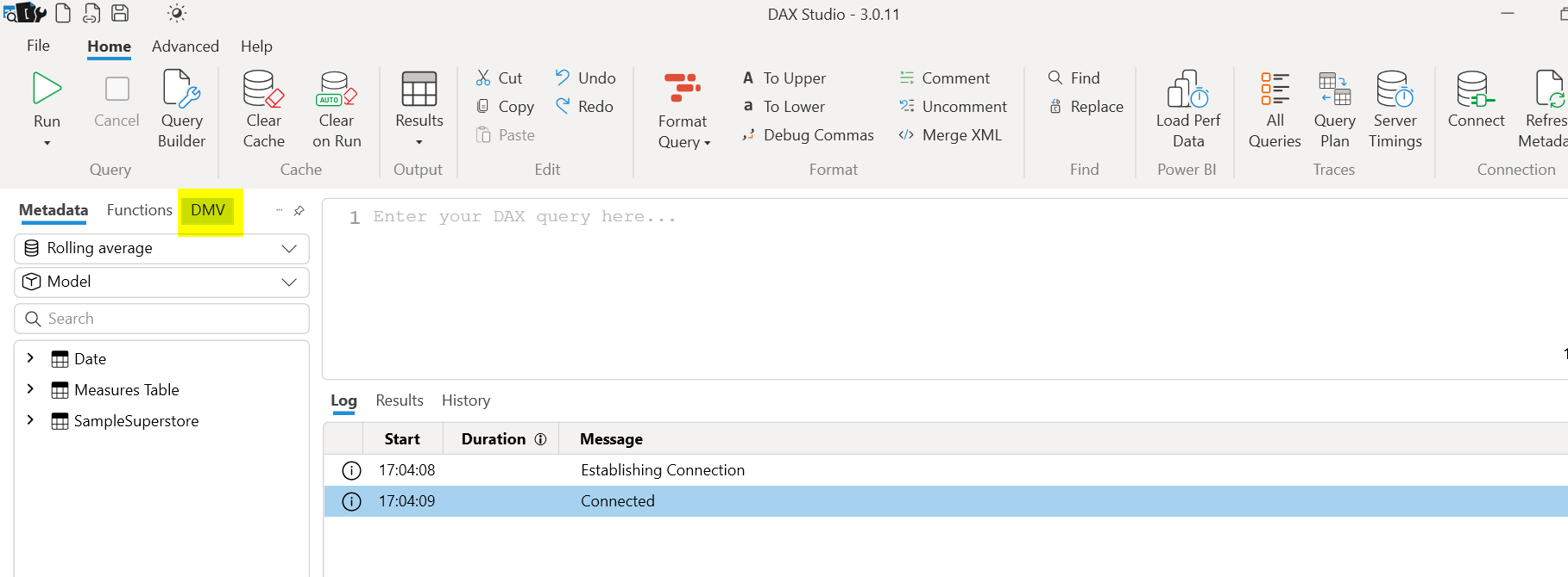 Open the DAX Studio it is located under the external tools once you open that it will open up a dialog box to connect to the right Power BI model. Once you are connected you can see on the left pane all the tables and on top of it there are different options- metadata, functions, and DMV.