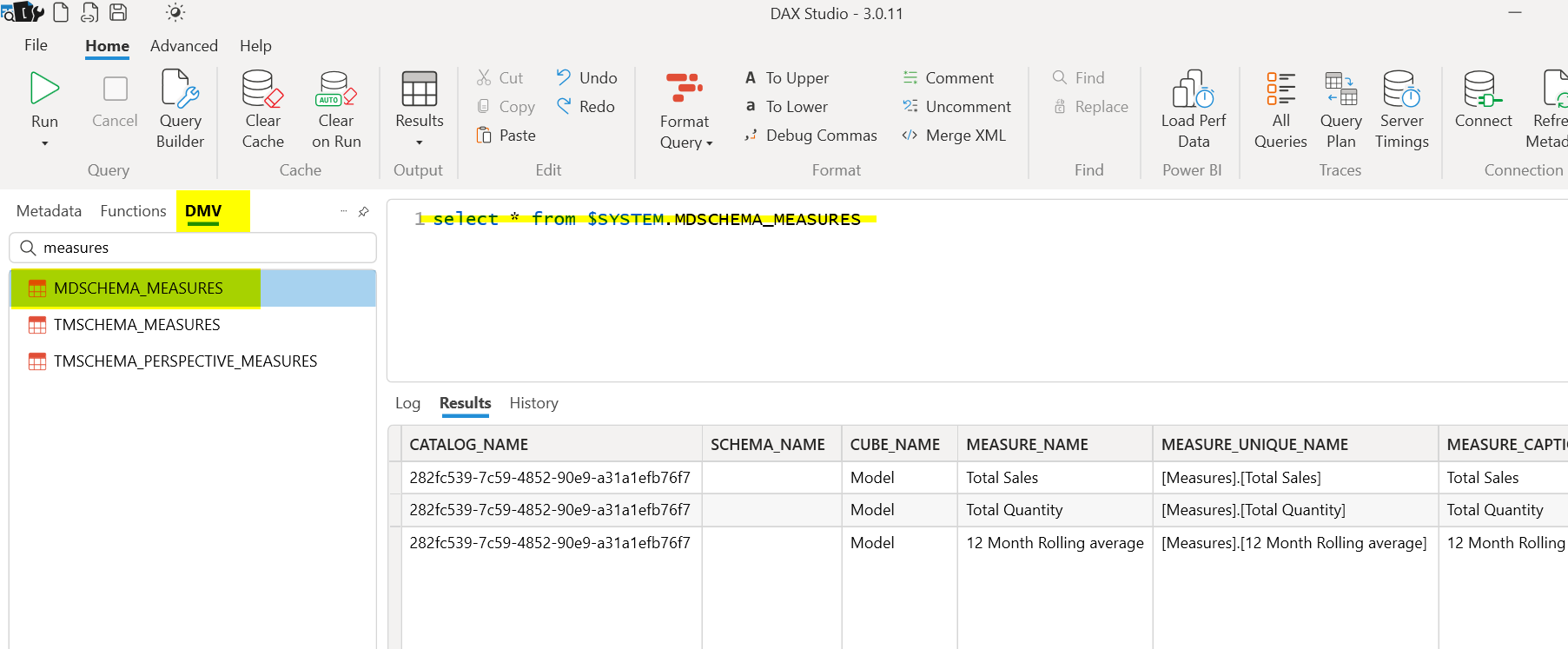For creating extract we will select DMV and under that MDSCHEMA_MEASURES. Double click on it and it will generate a basic query. Run it and you can see the list of all measures. To get it as an XLSX file just change the output to static and rerun the same query.