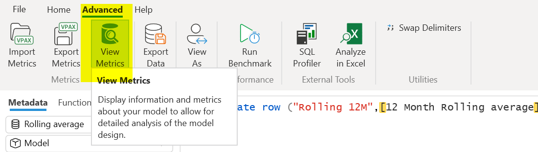 SIMPLE!! Isn't it? Let's go level ahead how to optimize the data model? You can do it via DAX Studio. With the inclusion of Vertipaq analyzer in DAX Studio you can optimize your data model. How to do it? Under the advanced section select the view metrics option.