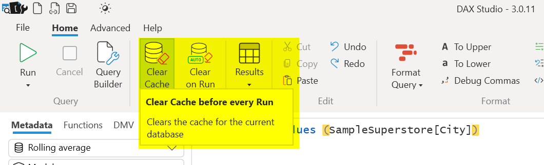 Pro tip: It is always recommended to clear the cache before running a query in DAX Studio. You can do it via a single click.