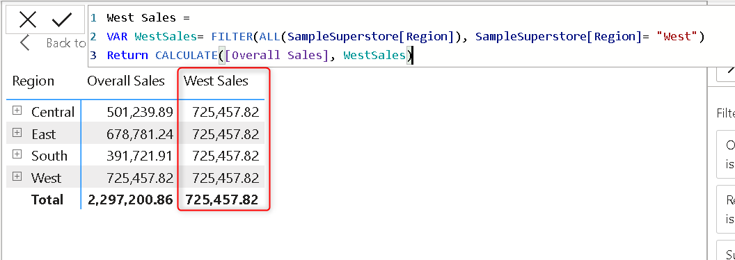 So let's clear out the ambiguity I will show how the variable works by using them in DAX under different conditions. I am considering Sample Superstore data to test the VAR. The use case is getting the West region Sales. For that, we are defining the Total Sales or Overall Sales by using the Sum of Sales and we will showcase all different regions and their respective sales.