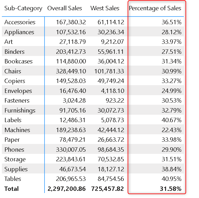 As you can see we defined two variables SalesTotal and West Sales also. Let's take all the sub-categories in the matrix and let's see how much percentage of sales is contributed by West.